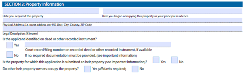 Heir Property is property owned by one or more individuals, where at least one owner claims the property as a residence homestead, and the property was acquired by will, transfer on death deed, or intestacy. An heir property owner not specifically identified as the residence homestead owner on a deed or other recorded instrument in the county where the property is located must provide:
